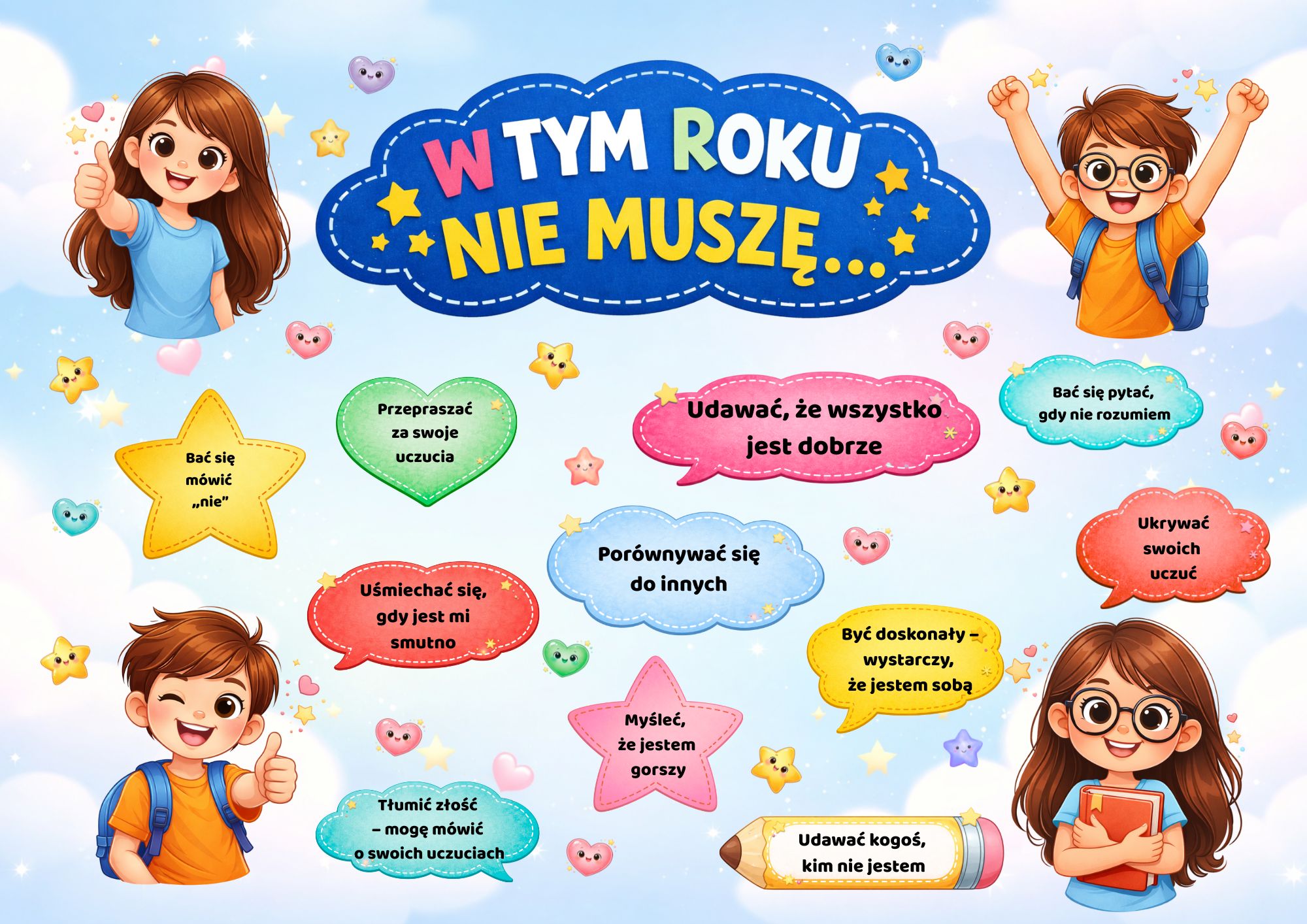 Zestaw „W TYM ROKU NIE MUSZĘ…” to gotowy materiał do przygotowania psychologiczno-wychowawczej gazetki, która: