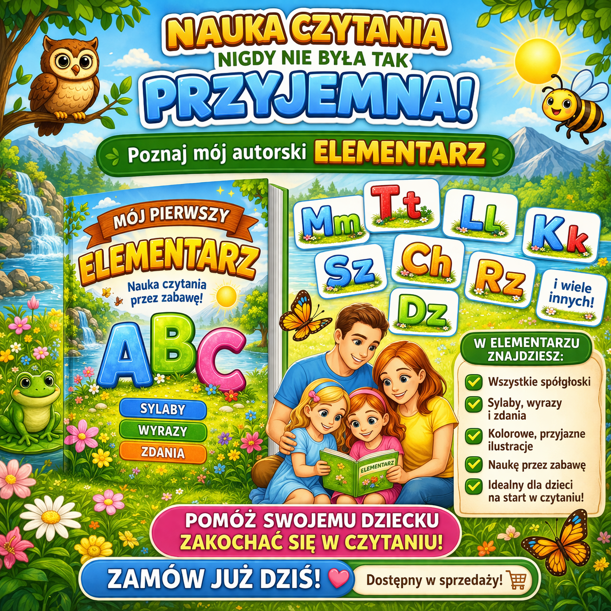 Kolorowy, autorski elementarz stworzony z myślą o dzieciach rozpoczynających naukę czytania.