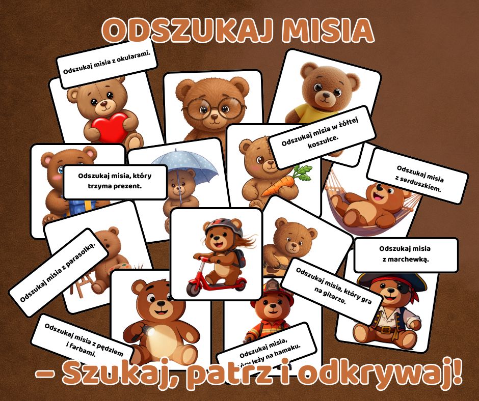 • 45 unikalnych kart z poleceniami w języku polskim (np. Odszukaj misia z parasolką, Odszukaj misia, który gra na gitarze)