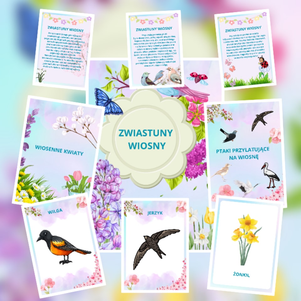 Plakaty zwiastuny wiosny łącznie 29 kart a na nich :